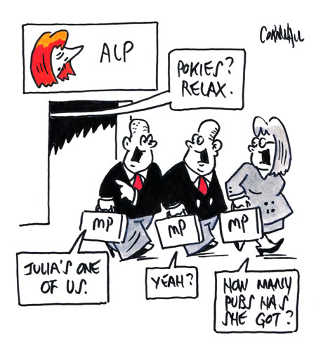 This would be lined up against any change announced by Julia Gillard. On the whole, in recent years the Coalition has tended to be stronger on combating the pokies than Labor and it was pleasing to see Tasmanian Liberal leader Will Hodgmen take a commitment to a $1 maximum bet to the recent state election.